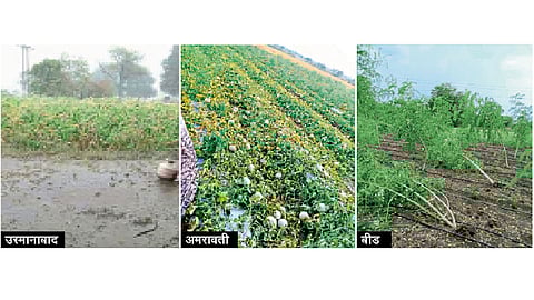 मराठवाड्यातील परभणी, हिंगोली, नांदेड जिल्ह्यांत मंगळवारी मध्यरात्री झालेल्या वादळी पावसामुळे रब्बी हंगामातील शेतामध्ये सोंगून ठेवलेल्या तसेच उभ्या ज्वारी, गहू, हरभरा आदी पिके भिजल्याने नुकसान झाले आहे. औरंगाबाद, जालना, बीड, उस्मानाबाद व लातूर या पाच जिल्ह्यांतील जवळपास ७० मंडळांत हजेरी लावणाऱ्या या वादळी पावसामुळे शेतकऱ्यांची तारांबळ उडाली, तर काढणीला आलेल्या गहू, मका, ज्वारी, हरभऱ्यासह आंबा, द्राक्ष, शेवगा आदी फळपिकांचे नुकसान झाले आहे. बीड जिल्ह्यातील अंकुश नवले या शेतकऱ्याचे गंगावाडी धोंडराई परिसरात शेतात लिंबाच्या झाडाखाली बांधलेले बैल व गाय अंगावर वीज पडून मृत्युमुखी पडली. जालना तालुक्यातील कडवंची शिवारात गारपीट झाली. या पावसामुळे ज्वारी, गहू, आंब्याला आलेला मोहोर व कडवंची शिवारातील द्राक्षासह डाळिंब पिकांचेही नुकसान झाले.