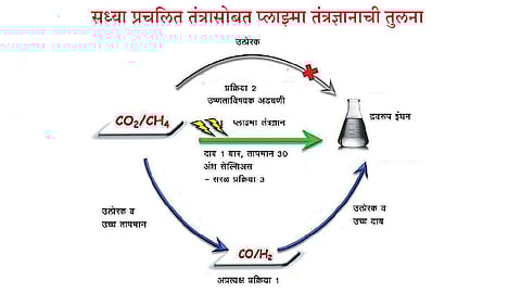 कार्बन डाय ऑक्साईड (CO२) आणि मिथेन (CH४) यांच्यापासून सरळ द्रवरूप इंधन किंवा रसायने मिळविण्याची प्लाझ्मा तंत्रज्ञानावर आधारित नवी पद्धती लिव्हरपूल विद्यापीठातील संशोधकांनी विकसित केली आहे. यामुळे या प्रक्रियेदरम्यान उत्सर्जित होणाऱ्या हरितगृह वायूंच्या प्रमाणामध्ये घट होण्यास मदत मिळेल, असा दावा केला जात आहे. हे संशोधन ‘जर्नल अँगेवाड्टे केमी’ या रसायनशास्त्राशी संबंधित संशोधनपत्रिकेमध्ये प्रकाशित करण्यात आले आहे.