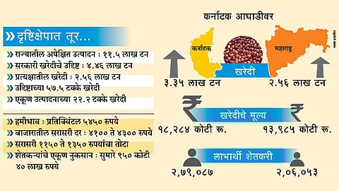 शेजारच्या कर्नाटकने तुरीच्या सरकारी खरेदीत महाराष्ट्रावर आघाडी घेतली आहे. कर्नाटक सरकारने २५ एप्रिलपर्यंत ३ लाख ३५ हजार ४९९ टन तूर खरेदी केली आहे. विशेष म्हणजे कर्नाटकात महाराष्ट्राच्या तुलनेत तुरीचे लागवड क्षेत्र २८.५ टक्के कमी असूनही तिथे महाराष्ट्रापेक्षा सुमारे ७८ हजार ८८४ टन तूर जादा खरेदी केली आहे. तसेच, कर्नाटक सरकारने गेल्या वर्षीप्रमाणे यंदाही तुरीच्या किमान आधारभूत किमतीवर आपल्या तिजोरीतून बोनस दिल्यामुळे महाराष्ट्रातील शेतकऱ्यांच्या तुलनेत तिथल्या शेतकऱ्यांना प्रतिक्विंटल ५५० रुपये अधिक दर मिळाला आहे.