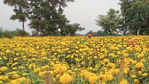 गणेशोत्सवापाठोपाठा जेष्ठा कनिष्ठा गौरींचा सण झाला. नवरात्र उत्सवामुळे मुंबईच्या बाजारात फुलांना मागणी पुन्हा वाढली आहे. माजलगाव तालुक्यातील मालीपारगाव येथील नाथा मांडवगणे, अंगद सोजे, सुग्रीव बागवाले, प्रल्हाद मांडवगणे या चार शेतकऱ्यांनी प्रत्येकी एक-एक एकर झेंडू फुलशेती करण्यासाठी आळेफाटा येथून २३ जूनला तीन रुपयाला एक रोप या प्रमाणे तीस हजार रोपे आणली. चार फूट अंतरावर एक बाय एक अंतरावर ठिबक सिंचनावर या रोपांची लागवड केली. परंतु मागील दीड महिना पावसाने हुलकावणी दिल्याने विहिरीतील पाणी साठा खालावत गेला. मात्र पैठणच्या धरणातील पाणी कॅनॉलद्वारे सोडण्यात आल्यामुळे ही फूलशेती बहरली.
