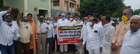 त्यांच्यावर हा अन्याय आहे. त्यामुळे नीट, जेईई रद्द करण्याची मागणी करीत काँग्रेस पदाधिकाऱ्यांनी शुक्रवारी अकोला जिल्हाधिकारी कार्यालयापुढे निदर्शने केली. त्यानंतर जिल्हाध्यक्ष हिदायत पटेल, महानगराध्यक्ष बबनराव चौधरी, कार्याध्यक्ष सुनीप पाटील धाबेकर यांच्या स्वाक्षरीने जिल्हाधिकाऱ्यांना परीक्षा नियोजित वेळेत न घेता पुढे ढकलण्याची मागणी करणारे निवेदन देण्यात आले. यावेळी मनपाचे विरोधी पक्ष नेते साजित खान पठाण, प्रकाश तायडे, प्रमोद डोंगरे, प्रशांत गावंडे, उदय देशमुख, प्रदीप वखारिया, डॉ. सुभाषचंद्र कोरपे, राजेश राऊत, जि.प. सदस्य चंद्रशेखर चिंचोळकर, दिनेश दुबे, अकोला महानगरपालिकेतील काँग्रेसचे नगरसेवक व पदाधिकारी, कार्यकर्ते मोठ्यासंख्येने उपस्थित होते.