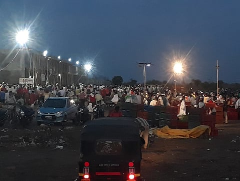 भाजी व फळ बाजारात होत असलेल्या गर्दीच्या तुलनेत येथे असलेली जागा कमी पडत आहे. अद्यापही येथील दुकानांचे बांधकाम पूर्ण झालेले नाही. त्यामुळे कमी जागेतच गर्दी होत असलल्याने सोशल डिस्टन्सिंग पाळणे जळपास अशक्य झाले आहे.