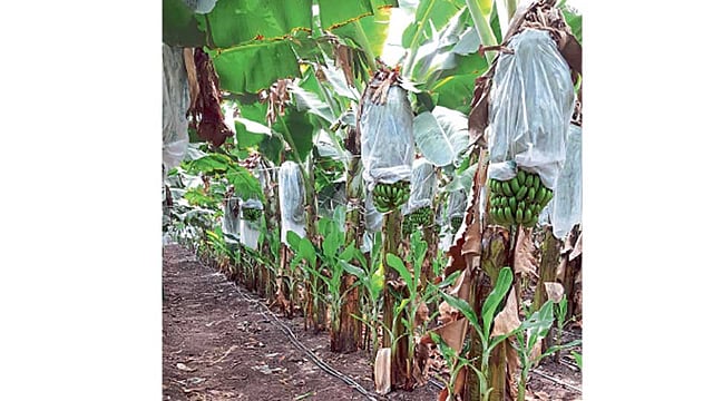मृगबाग लागवडीची केळी सध्या घड भरण्याच्या अवस्थेत आहे. त्यासाठी केळी बागेस ०:०:५० हे विद्राव्य खत २.५ किलो प्रतिदिवस याप्रमाणे ७५ किलो प्रतिएकर याप्रमाणे एक महिन्यात ठिबकद्वारे द्यावे.