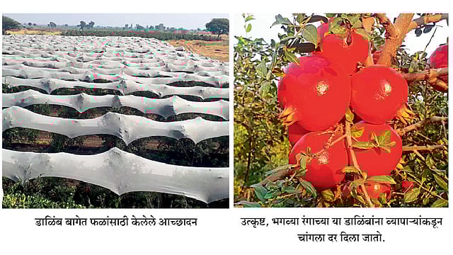 प्रखर उन्हापासून वाचविण्यासाठी थोडक्यात सनबर्निंगची समस्या टाळण्यासाठी संपूर्ण ४० एकर डाळिंबात व २० एकर द्राक्षात मागील वर्षी बागेवरून नेट आच्छादनाचा यशस्वी प्रयोग केला. मात्र खर्च काही लाख रुपयांवर गेला. मात्र तो कमी करण्यासाठी मुलींच्या ड्रेसवर परिधान केल्या जाणाऱ्या नायलाॅनच्या अोढणी वस्त्राचा वापर केला. त्यासाठी गुजरात राज्यातील वापी येथील कंपनीच्या प्रकल्पाला भेट देऊन तेथून मटेरियल आणले. यंदा संपूर्ण डाळिंब व द्राक्षबागेत आच्छादन केले आहे. एकरी केवळ साडे १६ हजार रुपयांमध्ये हे काम झाले. या वस्त्राचा वापर पुढील हंगामातही करणे शक्य असल्याचे पवार म्हणाले. या आच्छादनामुळे सनबर्निंगची समस्या दूर होते. फळांना चांगले शायनिंग येते, थ्रिप्स नियंत्रणात येतो, दोन फवारण्यांमधील अंतर वाढते, फळाची गुणवत्ता सुधारते असे पवार यांनी सांगितले.