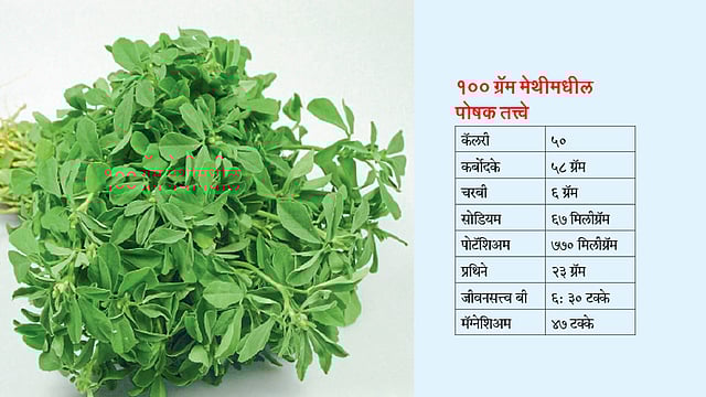 मेथीमध्ये अनेक औषधी गुणधर्म देखील आढळतात. ज्याचा आरोग्यावर खूप चांगला फायदा होतो. मेथीमध्ये थियामिन, फॉलिक ॲसिड, रिबोफ्लाव्हिन, नियासिन, जीवनसत्त्वे अ, बी ६ आणि सी सारख्या जीवनसत्त्वे असतात, तसेच तांबे, पोटॅशियम, कॅल्शिअम, लोह, सेलेनियम, जस्त, मॅंगनीज आणि मॅग्नेशिअम सारखी खनिजे आहेत. मेथीचे दाणे जीवनसत्त्व के चा समृद्ध स्रोत आहे. जे आपल्या शरीरासाठी लाभदायक ठरतात.