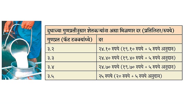 नव्या धोरणाप्रमाणे ३.२ फॅटसाठी २४.१० रुपये (१९.१० रुपये अधिक पाच रुपये अनुदान) रुपये दर आता शेतकऱ्याला मिळणार असून, फक्त ३.५ फॅटसाठी २५ रुपये दर मिळणार आहे. दूध संघ व खासगी प्लॅन्टचालकांना या योजनेचा लाभ घेण्यासाठी प्रादेशिक दुग्धविकास अधिकाऱ्याकडे अर्ज करावे लागतील. राज्यात प्रतिलिटर रोज किमान दहा हजार लिटरचे दूध गोळा करणाऱ्या संस्थांना या योजनेत सहभागी होण्यासाठी अर्ज करता येईल. त्याखालील दूध संकलकांनी त्यांच्या सोयीनुसार सहकारी किंवा खासगी संस्थेला दूध द्यावे, असे शासनाने म्हटले आहे.