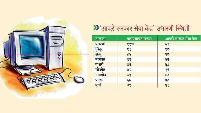 परभणी जिल्ह्यात ७०४ ग्रामपंचायती आहेत. त्यापैकी १५ लाख रुपयांपेक्षा जास्त उत्पन्न असलेल्या ६९ ग्रामपंचायतींमध्ये तसेच १५ लाखांपेक्षा कमी उत्पन्न असलेल्या २०४ ग्रामपंचायतींमध्ये (स्वच्छेने) स्वंतत्र आपले सेवा सरकार केंद्रांची उभारणी करण्यात आली आहे. १५ लाख रुपयांच्या आत उत्पन्न असलेल्या ४३१ ग्रामपंचायतींचे क्लस्टर तयार करून १८९ आपले सेवा सरकार सेवा केंद्राची उभारणी करण्यात आली.