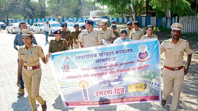 अहमदनगर : उपप्रादेशिक परिवहन कार्यालय व जिल्हा रस्ता सुरक्षा समितीच्या वतीने, रस्ते अपघातात जीव गमावलेल्या व्यक्तींना श्रद्धांजली वाहण्यात आली. अपघात टाळण्यासाठी वाहतुकीच्या नियमांचे पालन करण्याकरिता शहरातून जनजागृती फेरी काढण्यात आली. अपघातग्रस्तांचे जीवनदूत म्हणून कर्तव्य बजावण्याचे आवाहन यावेळी नागरिकांना करण्यात आले.
