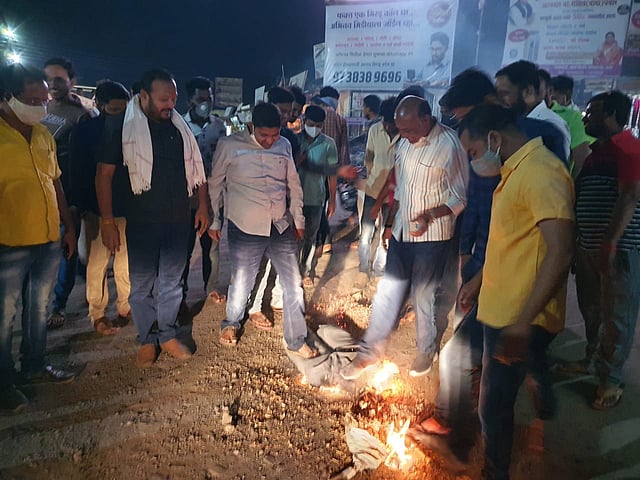 कर्जत (अहमदनगर) : उत्तरप्रदेश येथील हाथरसमधील पीडितेच्या शोकात असलेल्या कुटुंबियांची भेट घेण्यासाठी पायी चालत निघालेले काँग्रेसचे नेते खासदार राहुल गांधी आणि प्रियांका गांधी यांना तेथील पोलिसांकडून झालेल्या धक्काबुक्कीच्या आणि अटकेच्या निषेधार्थ येथे काँग्रेस, महिला काँग्रेस व युवक काँग्रेसच्या वतीने मुख्यमंत्री योगी आदित्यनाथ यांचा पुतळा जाळून निषेध करण्यात आला.