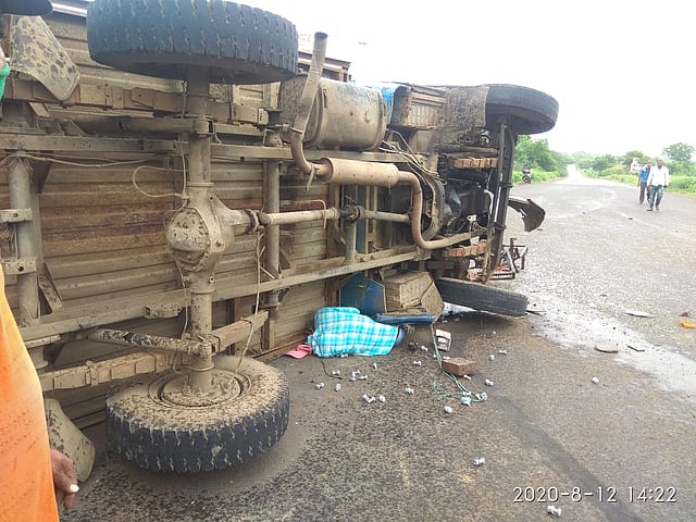 त्यात पुढे बसलेले अभियंता व मजूर खाली सापडून जागीच ठार झाले. मागे बसलेले हे चौघे सिमेंट गोण्याखाली दबल्याने जखमी झाले आहेत. त्यात दोघांची प्रकृती चिंताजनक आहे. या अपघातात संदीप दादाराव मिरेकर (वय २७, रा. मोरखेड, ता. मेखर, जि. बुलढाणा) व भिवाजी नागेंद्र जोंधळे (वय २६, रा. सोनपल्ली, ता. श्रीकोंडा, जि. आदीलाबाद) हे दोघे जागीच ठार झाले. विष्णू राम वेताळकर (वय २६) व विनोद सुभाष गुंजकर (वय २६, दोघे रा. उकळी), नितीन रामभाऊ हुलगुंडे (वय २१, रा. माजलगाव, जि. बीड) व गोपाळ अशोक पवार (वय २४, रा. भोदखेड, जि. बुलढाणा) हे चौघे गंभीर जखमी झाले आहेत. अपघात घडल्यानंतर उपविभागीय पोलिस अधिकारी संजय सातव, पोलिस निरीक्षक सुनील गायकवाड, पोलिस कर्मचारी प्रमोद हंचे घटनास्थळी दाखल झाले.