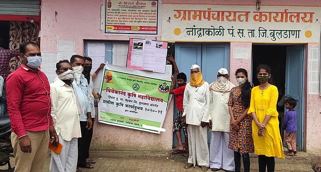 हिवरा आश्रम (जि.बुलडाणा) : शेतकरी बांधवांसाठी आधुनिक शेती संबधी माहिती व शेतीकरी यशोगाथा, शेती पुरक व्यवसाय माहिती, कीड व्यवस्थापन, पाणी व्यवस्थापन, बागायती शेती, पशू पालन, फळबाग लागवड या संबंधी शेतकऱ्यांना माहिती होण्याच्या दृष्टीने विवेकानंद कृषी महाविद्यालयाच्या कृषी कार्यानुभवाच्या विद्यार्थींनी अर्चना काकडे व निकिता पारवे या विद्यार्थिनींनी ग्रामपंचायत कार्यालयात नांद्रा कोळी येथे परिसरातील बळीराजासाठी इन्फॉर्मेशन कॉर्नर सुरू केले आहे.