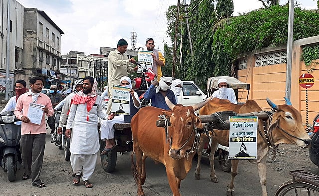 अकोला ः आंतरराष्ट्रीय बाजार कच्चा इंधनाचे दर कमी झाले असताना त्याचा फायदा जनतेला न देता उलट पेट्रोल-डिझेलचे दर वाढवून नागरिकांची आर्थिक लुट केली जात आहे. त्या निषेधार्थ अकोल्यात महाविकास आघाडीतील शिवसेना व काँग्रेसच्या वतीने सोमवारी आंदोलन करण्यात आले.