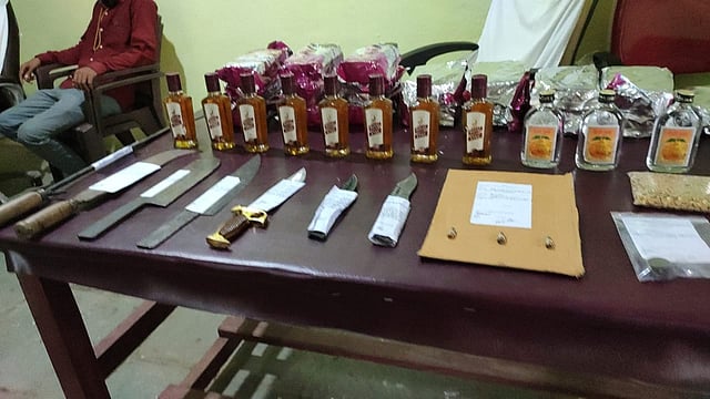 घरांमधून गोवा,नजर कंपनीचे १८ गुटका पॉकेट, रॉयल स्टॅग कंपनीची विदेशी दारू चे ८ बॉटल, सखु संत्रा कंपनीचे देशी दारूचे ५ बॉटल तसेच २ लोखंडी कोयते, २ लोखंडी सुरा, ३ धारदार चाकू व देशी बनावटीचे ३ जिवंत काडतूस व नकली सोन्याच्या गिण्या वजन अंदाजे १ किलो २०० ग्रॅम व नकली सोन्याच्या गिन्या बनवण्याचे २ शिक्के सहकारी पंचा समक्ष पंचनामा करून सर्व साहित्य जप्त करून पोलीस स्टेशनला आणण्यात आले आहे.