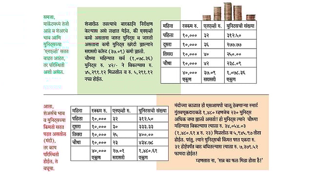 ‘एसआयपी’च्या यशामागे जे रहस्य दडले आहे, त्याला ‘रुपी कॉस्ट ॲव्हरेजिंग’ असे म्हणतात. जेव्हा आपण एखाद्या योजनेत ‘एसआयपी’ करतो तेव्हा दर महिन्याला एक ठरावीक रक्कम गुंतवीत असतो. खरेदीची किंमत (नेट ॲसेट व्हॅल्यू) मात्र दर महिन्याला बदलत असते. जेव्हा ‘एनएव्ही’ जास्त असते, तेव्हा कमी युनिट्स खरेदी केली जातात; तर जेव्हा ‘एनएव्ही’ कमी असते, तेव्हा तेवढ्याच पैशात जास्त युनिट्स खरेदी होतात व त्यामुळे आपली युनिट्स खरेदीची सरासरी किंमत कमी होते. शिवाय, आपण छोटी खरेदी करीत असल्याने ‘मार्केट टायमिंग’ करण्याचा प्रश्नच उरत नाही! शेअरबाजार कधी ‘व्होलॅटाइल,’ कधी तेजीत तर कधी मंदीत असतो. त्याकडे दुर्लक्ष करून आपण जर सातत्याने ‘एसआयपी’ काही दशकांसाठी चालू ठेवल्यास संपत्तीच्या निर्मितीची प्रक्रिया ‘ऑटोपायलट’वर टाकल्यासारखे होते.
