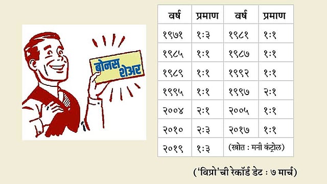 ‘विप्रो’ने १९७१ पासून आतापर्यंत दिलेल्या बोनस शेअरची माहिती सोबतच्या तक्त्यात दिली आहे. ज्या गुंतवणूकदाराकडे १९७१ पासून या कंपनीचे शेअर असतील, त्यांना नक्कीच भरभरून फायदा झाला असणार, हे सहज लक्षात येते. भारतीय शेअर बाजारात अशा अनेक चांगल्या कंपन्या आहेत. आवश्यकता आहे ती गुंतवणूकदारांनी अशा चांगल्या कंपन्या निवडून त्यात दीर्घकाळासाठी गुंतवणूक करण्याची!