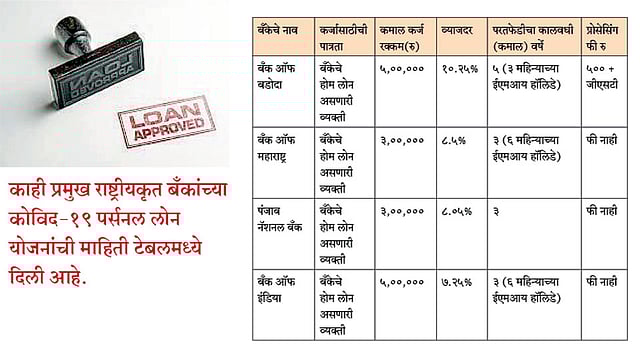 कोरोनाच्या साथीने संपूर्ण देशभर थैमान घातले आहे. या साथीला शक्य तितक्या लवकर आटोक्यात आणण्याच्या दृष्टीने सरकारने सुरवातीपासूनच (२५ मार्च २०२० पासून ) लॉकडाऊन लागू केला आहे. मात्र, लहान-मोठे व्यवसाय, ओला/उबर/रिक्षा चालक, रस्त्यावर विक्री करणारे किरकोळ विक्रेते, स्पा/सलून्स, यासारखे व्यवसाय बंद झाले आहेत, तसेच कामावर न जाऊ शकणारे छोट्या खाजगी व्यावसायिंकांकडील नोकरदारांपुढे आर्थिक समस्या उभी राहिली आहे, यावर मात करता यावी या उद्देशाने राष्ट्रीयकृत व खाजगी बॅंका, एनबीएफसी व पी२पी लेंडिंग करणाऱ्या वित्तीय संस्थांनी कोविद-१९ वैयक्तिक कर्ज योजना कार्यान्वित केल्या आहेत. प्रत्येकाच्या अटी व शर्ती थोड्याफार फरकाने सारख्याच असून किमान रु.२५,००० ते कमाल रु.५ लाख इतके कर्ज अर्जदाराच्या पात्रतेनुसार मिळू शकते.