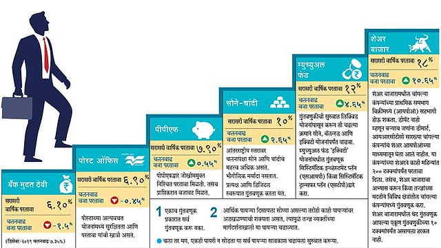 बहुतांश गुंतवणूकदारांची बचत आणि गुंतवणुकीची सुरुवात बॅंकेत ठेवी (एफडी), अल्पबचत योजना अशा पारंपरिक गुंतवणुकीच्या साधनांपासून होते. कारण ही गुंतवणूक सर्वाधिक सुरक्षित असते. मात्र, आपण केलेली गुंतवणूक आणि त्यावर मिळणारा परतावा याची कधी चलनवाढीच्या दराशी आपण तुलना करत नाही. सध्या चलनवाढीचा दर 7.35 टक्के आहे, त्यामुळे काही गुंतवणूक साधनांमधील गुंतवणुकीवर नकारात्मक परतावा मिळतो. मात्र, ते प्रत्यक्षात लक्षात येत नाही. चलनवाढीवर मात करण्याकरिता थोडी जोखीम घेऊन क्रमाक्रमाने गोष्टी केल्या तर पुढे निवृत्तीपर्यंत आणि नंतर नक्कीच मोठी पुंजी उभी राहू शकते. कोणत्या आहेत अशा गोष्टी? थोडक्यात पाहूया.