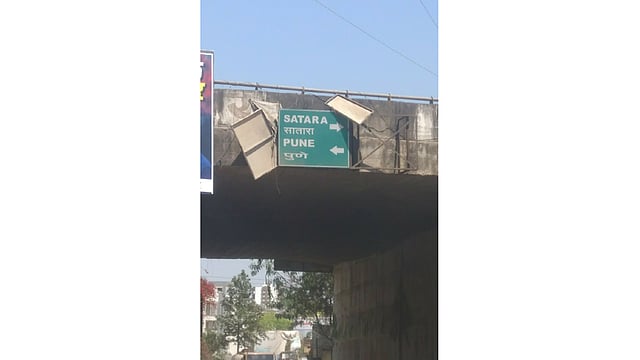 पुणे : कात्रज नऱ्हे रस्त्य़ावर भुमकर चौकात दिशादर्शक फलक धोकादायक अवस्थेत लटकत असून केव्हाही कोसळून अपघात होऊ शकतो. तरी याकडे गांभीर्याने लक्ष देण्याची आवश्यकता आहे. वाहतूक पोलिसांनी याची दखल घेवून तातडीने कारवाई करावी अन्यथा एखादा अपघात होऊ शकतो.