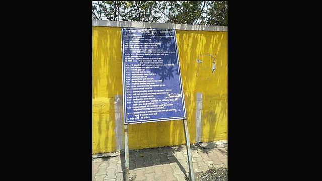 पुणे : साहित्यरत्न लोकशाहीर आण्णाभाऊसाठे कला रंगमंदिर, येरवडा येथील बाहेरच्या पादचारी मार्गावरील महात्मा ज्योतिबा फुले यांचा इतिहास सांगणारा फलक कोलमडलेल्या अवस्थेत दिसत आहे. बोर्डाच्या जड वजनाने व बोर्डाचे पाय खोल जाण्यासारखे नसल्याने बोर्डाला सरळ उभ्या अवस्थेत स्थिर ठेवता येत नाही.