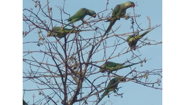 सहकारनगर : तळजाई टेकडीवर असणाऱ्या वृक्षसंपदेमध्ये असणाऱ्या देशी झाडांना विविध प्रकारच्या फळांचा हंगाम चालू झाला असून भोकरांच्या फळाचा आस्वाद घेताना हा पहाडी पोपटांचा थवा
