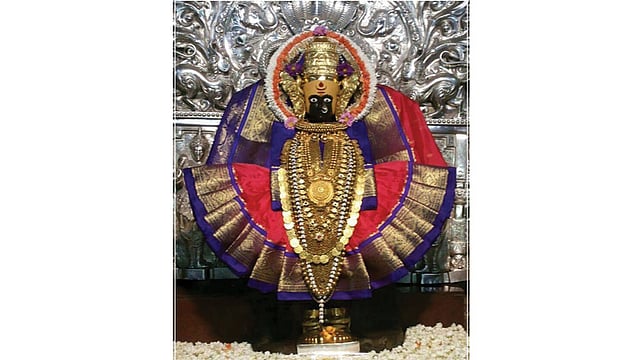 पायांत सुवर्णसाखळ्या आहेत. तोडे आहेत. अंगावर भरजरी पैठणी आहे. मंदिराच्या आवारातील शिलालेखावर देवीचे वर्णन केलेले आहे. त्यात म्हटले आहे, की, ‘शुभायास्तु महालक्ष्मीर्भवतां भवतारिणी। बिभ्रती शिरसा लिंगमशेषा घौघहारिणी।।...’ देवी भागवत ग्रंथामध्येही कोल्हापूरचा आणि महालक्ष्मीचा उल्लेख आढळतो. ‘कोल्हापुरं महास्थानं यत्र लक्ष्मीः सदास्थिता।’ असा हा कोल्हापूरचा महिमा आहे. पद्मपुराणातही असाच उल्लेख आहे. करवीर माहात्म्य या संस्कृत ग्रंथातही कोल्हापूरचा उल्लेख आहे. त्यात म्हटले आहे, की करवीर अर्थात कोल्हापूर भागात कोलासुर व त्याचा मुलगा करवीर खूप उन्मत्त झालेले होते. अनेक ऋषिमुनी, संत-माहात्म्यांना त्यांचा त्रास होत होता. अनेकांना त्यांनी छेडले होते. त्यांच्या जाचातून कधी सुटका होते, याची लोक आतुरतेने वाट पाहात होते. त्यांनी देवतेचा धावा केला. भक्तांची हाक देवीने ऐकली. कोलासुर आणि करवीराच्या जाचातून भक्तांना, जनतेला मुक्त करण्यासाठी जगत्जननी माता महालक्ष्मी तिथे प्रकट झाली. तिने कोलासुर व करवीराचा वध केला. जनतेला सुखी केले. या राक्षसांच्या नावावरूनच या भागाला कोल्हापूर आणि करवीर अशी नावे पडली. महालक्ष्मीची नित्योपासना पहाटे पाच वाजता सुरू होते. रात्री अकरा वाजता शेजारती होते. शेजारतीच्या वेळची पूजा पहाटे उतरवली जाते. देवीच्या चरणांवर दुग्धाभिषेक केला जातो आणि नित्योपासना सुरू होते. दुग्धाभिषेकानंतर गंध, पुष्प व वस्त्रादी उपचारांनी देवीची पूजा केली जाते.