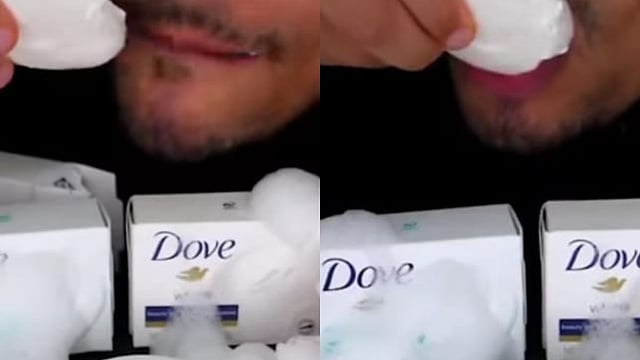 या व्हिडीओत तुम्ही पहाल की एक तरुण डव साबण खाताना दिसत आहे. त्याच्यासमोर अनेक डव साबण बॉक्समध्ये ठेवण्यात आले आहे. साबणासोबत स्पंज आहे, ज्यावर साबणाचा फेस असून तरुण मध्येच तो फेस पाणी प्यावं तसं पिताना दिसतोय. हा विचित्र वाटणारा व्हिडीओ सध्या सोशल मीडियावर प्रचंड व्हायरल होतोय. त्वचेवर हा साबण लावल्याने त्वचा उजळते, असे आपण ऐकले असाल पण त्यासाठी साबण खावी, हा कोणता पर्याय?