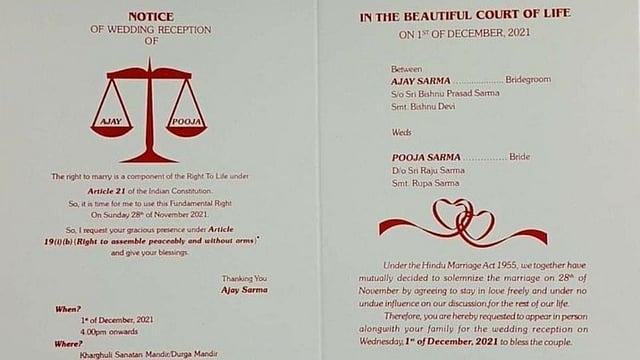 गुवाहटी : आपल्या लग्नाची पत्रिका इतरांच्या तुलनेत वेगळी आणि चर्चेचा विषय असवी असे प्रत्येकालाच वाटत असते. नुकतीच एका व्यक्तीनं आपला राजकीय विरोध दाखवण्यासाठी आपल्या मुलीच्या विवाह समारंभापासून भाजप-जेजेपी-आरएसएसच्या कार्यकर्त्यांनी दूर रहावं, असा उल्लेख असल्याची लग्नपत्रिका सोशल मीडियात (Social Media) व्हायरल झाली होती. या पत्रिकेची चर्चा थांबते न थांबते तोच आसाम येथील एका वकिलाने (Lawyer wedding card viral) त्याच्या लग्नाच्या पत्रिकेत संविधान थीम असलेली लग्नपत्रिका छापली आहे. ही पत्रिकादेखील मोठ्या प्रमाणात सोशल मीडियावर व्हायरल झाली आहे.