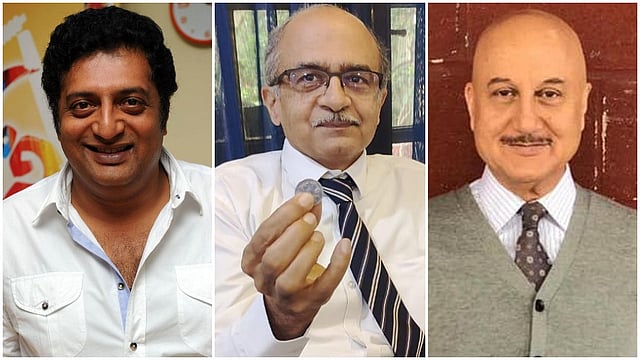 नवी दिल्ली- ज्येष्ठ वकील आणि सामाजिक कार्यकर्ते प्रशांत भूषण (Prashant Bhushan) यांना न्यायालयाने एक रुपयाचा दंड ठोठावला आहे. सरन्यायाधीश शरद बोबडे आणि सर्वोच्च न्यायालय (Supreme Court) यांच्या अवमानाप्रकरणी त्यांना ही शिक्षा सुनावण्यात आली. यानंतर देशभरातून त्यांच्या शिक्षेवर प्रतिक्रिया येत आहेत. चित्रपटसृष्टीतील दोन प्रसिद्ध कलाकारांनी यासंदर्भात केलेले ट्विट सध्या मोठ्या प्रमाणात व्हायरल होत आहे. अनुपम खेर आणि प्रकाश राज यांनी न्यायालयाने प्रशांत भूषण यांना शिक्षा सुनावण्यानंतर वेगवेगळ्या प्रतिक्रिया दिल्या आहेत.