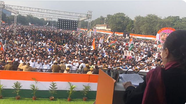 आर्थिक मंदी, बेरोजगारी, शेतकऱ्यांचे प्रश्न या मुद्द्यांवर आक्रमक होत काँग्रेसकडून आज (शनिवार) पंतप्रधान नरेंद्र मोदी सरकारविरोधात 'भारत बचाओ' रॅलीचे आयोजन केले होते. दिल्लीत रामलीला मैदानावर 'भारत बचाओ रॅली' घेण्यात आली. या रॅलीद्वारे काँग्रेसने जोरदार शक्तिप्रदर्शन केले. या रॅलीला काँग्रेस अध्यक्षा सोनिया गांधी, राहुल गांधी, प्रियांका गांधी, माजी पंतप्रधान डॉ. मनमोहनसिंग यांच्यासह प्रमुख नेते उपस्थित होते.