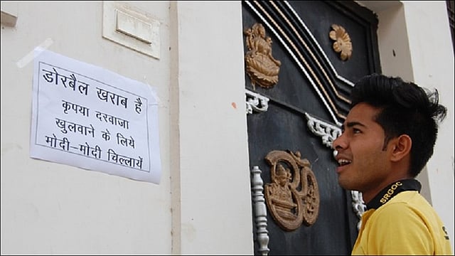 मुरैना शहरामधील रामनगर येथील रहिवाशी भाजपचे समर्थक आहेत. या परिसरातील अनेक घरांच्या बाहेर मुख्य प्रवेशद्वाराच्या डोअरबेलखाली मोदींच्या समर्थनार्थ भन्नाट पोस्टबारी केली आहे. घरांबाहेरील डोअरबेलवर ‘डोअर बेल खराब है, कृपया दरवाजा खुलवाने के लिये मोदी-मोदी चिल्लायें’ अशी सूचना लिहिण्यात आली आहे. प्रचाराला येणाऱ्यांनी दरवाजाची बेल वाजवून त्रास देऊ नये, म्हणून आम्ही ही शक्कल लडवली आहे. रामनगर कॉलिनीमधील 100 हून अधिक घरांच्याबाहेर अशा प्रकारचे कागद चिटकवण्यात आले आहेत. आम्ही दरवाजा उघडावा असे वाटत असेल तर जोरात बेल दाबवण्याऐवजी मोदी.. मोदी.. ओरडा असे या रहिवाश्यांना सांगायचे आहे. या परिसरामधील बहुतेकजण हे भाजप समर्थक असून, या पोस्टर्सच्या माध्यमातून पंतप्रधान मोदींची लोकप्रियताही दिसून येत आहे.