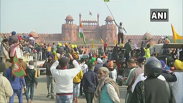 - एका आंदोलकाने लाल किल्ल्यावरील एका घुमटावर चढून तिथे झेंडा लावला आहे.
