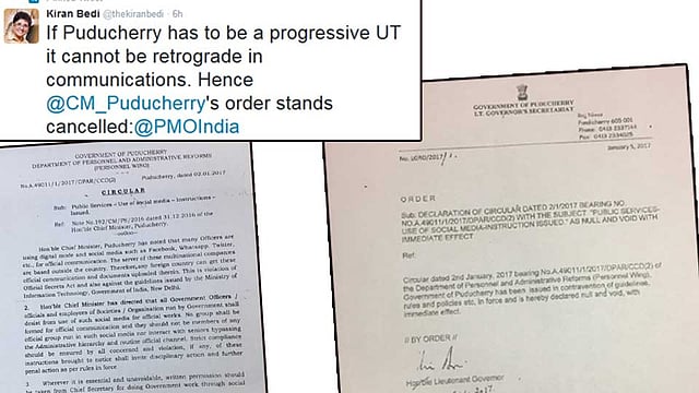 पुद्दुचेरी : कार्यालयीन कामकाजासाठी संवादाचे साधन म्हणून फेसबुक, व्हॉटसऍपसारख्या सोशल मिडियचा वापर करता येणार नसल्याबाबत पुद्दुचेरीचे मुख्यमंत्री व्ही. नारायणस्वामी यांनी काढलेले परिपत्रक नायब राज्यपाल किरण बेदी यांनी रद्दबातल ठरविले आहे.