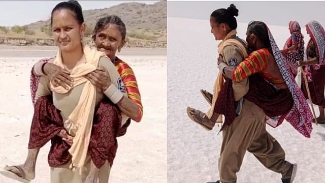 या व्हिडिओत महिला पोलीस कर्मचाऱ्याने वृद्ध महिलेला कडक उन्हात स्वत: च्या खांद्यावर 5 किलोमीटर उचलून सुखरूप घरी पोहोचवले. ही वृद्ध महिला गुजरातमधील कच्छमधील एका मंदिरात मोरारीबापूंची कथा ऐकण्यासाठी आली होती. यादरम्यान उन्हामुळे ती बेशुद्ध झाली होती. या महिला पोलिसाचे देशभरातून कौतुक केले जात आहे.