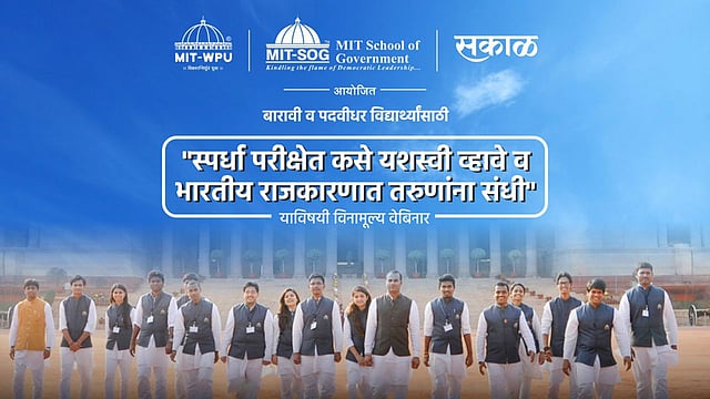 हा ट्रेंड लक्षात घेता, विद्यार्थ्यांना प्रशिक्षण देणं अत्यंत गरजेचं आहे. त्यामुळेच एमआयटी वर्ल्ड पीस युनिव्हर्सिटीचे कार्यकारी अध्यक्ष यांनी एमआयटी स्कूल ऑफ गव्हर्नमेंटची (एमआयटी-एसओजी)संकल्पना मांडली. समाजाच्या सर्व स्तरांतून देशासाठी उत्साही आणि वचनबद्ध राजकीय नेतृत्व निर्माण करण्याची त्यांचा संकल्प आहे. याचसाठी सोमवार, दि. १७ ऑगस्ट २०२० रोजी सकाळी ११ वाजता पदवीधर विद्यार्थ्यांसाठी एमआयटी - स्कुल ऑफ गव्हर्नमेंट आणि सकाळ माध्यम समूह यांच्या संयुक्त विद्यमाने "भारतीय राजकारणात तरुणांना संधी" याविषयी विनामूल्य वेबिनार आयोजित करण्यात आले आहे. या वेबिनारमध्ये तरुणांना एकूणच राजकारणातील संधी आणि त्यासाठी आवश्यक असणाऱ्या सर्व बाबी तसेच राजकारणात प्रवेश करू इच्छिणाऱ्या तरुणांसाठी तयार करण्यात आलेल्या अभ्यासक्रमाविषयी विनामूल्य मार्गदर्शन करण्यात येणार आहे. यासाठी ऑनलाईन नावनोंदणी सुरु असून आपण आताच दिलेल्या लिंकवर क्लिककरून आपले नाव नोंदवू शकता.