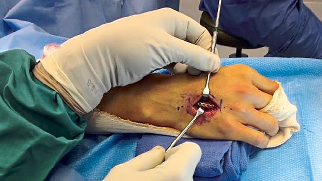 हातावर उघड्या दुखापती असतील तर त्यासाठी शस्त्रक्रियेची गरज भासते. या वेळी जखमेची संपूर्ण स्वच्छता केली जाते आणि इजा झालेल्या अवयवातील मृत पेशींना बाहेर काढले जाते. त्यानंतर तुटलेले हाड स्थिर राहण्यासाठी त्यामध्ये के-वायर (धातूची वायर जी हाडामध्ये जाऊन त्याला पूर्वपरिस्थितीत आणते) बसवली जाते. हाडांची संरचना पूर्वस्थितीत आणल्यावर मग दुखापत तपासण्यासाठी पूर्ण पेशींचे परीक्षण केले जाते. स्नायू, शिरा व स्नायुबंध, नसा तसेच रक्तवाहिन्या यांचा या परीक्षणात समावेश होतो. हे परीक्षण मायक्रोस्कोपचा वापर करून केले जाते. कारण याद्वारे सर्जनाला अगदी सूक्ष्म इजासुद्धा समजते. त्यामुळे दुखापत झालेल्या अवयवाच्या आतील छोटी इजासुद्धा उपचारांविना राहिली नाही, याची सर्जनाला खात्री राहते. हातामधील प्रत्येक छोटी संरचना अतिशय नाजूक असते आणि प्रत्येकाला स्वतंत्र काम असते. त्यामुळे सर्व सूक्ष्म इजांवर तसेच आतील संरचनेवरसुद्धा योग्य प्रकारे उपचार करावा लागतो. तरच शस्त्रक्रियेनंतर सकारात्मक परिणाम दिसून येतात.