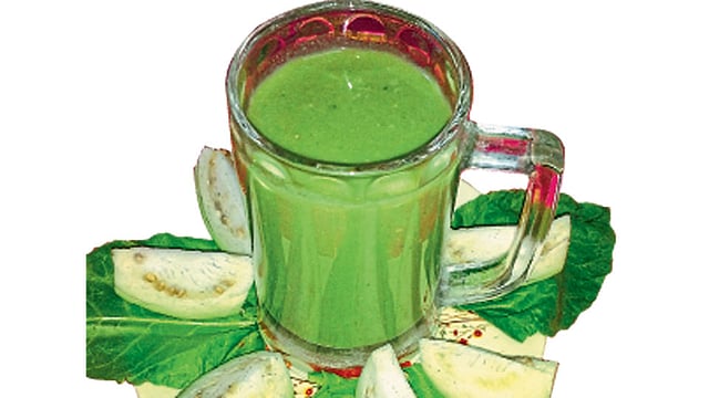 साहित्य - २ मोठे पिकलेले पेरू, पालकाची ५-६ फक्त पाने (देठ नको), साखर, १ वाटी दूध.