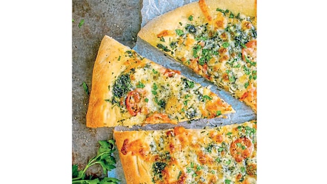 कृती - उकडलेले बटाटे बारीक कुसकरून घ्यावेत. त्यात २ चमचे तेल, मीठ, बेकिंग पावडर, चिली फ्लेक्स, ऑरेगानो, कोथिंबीर घालून सर्व मिक्स करावे. त्यात ४ चमचे मैदा टाकून कणकेसारखा गोळा बनवा. झाकून बाजूला ठेवा. बटर, मेयोनीज, चिली फ्लेक्स, ऑरेगानो, थोडी कोथिंबीर सर्व बाऊलमध्ये मिक्स करावे. मैद्याच्या कणेकचा गोळा घेऊन त्याची जाडसर पोळी लाटावी. त्यावर गार्लिक बटर मेयोनीजचे मिश्रण लावावे. आता अर्ध्या भागावर सिमला मिरची, मक्याचे दाणे टाकावेत. किनारी सोडून, परत वर चिली फ्लेक्स, ऑरेगानो टाकावे. चीज किसून अर्धा भाग फोल्ड करावा. वर बटरने ब्रशिंग करावे. वरही चिली फ्लेक्स, ऑरेगानो, आणि थोडे चीज किसून टाकावे.