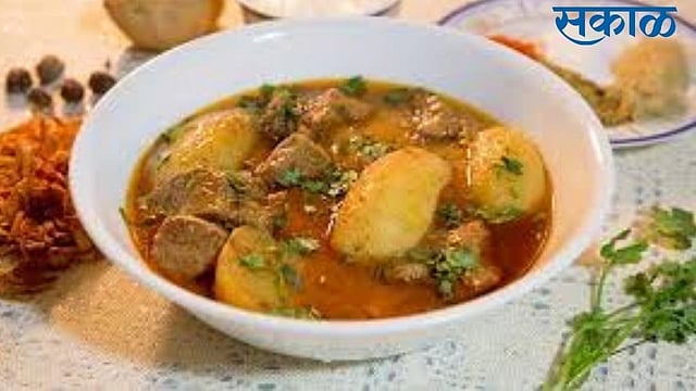 या रेसिपीमध्ये तुम्हाला मध्यम आणि मोठ्या आकारात मटणाचे तुकडे आणि त्याच आकारात गोल किंवा अंडाकार बटाटे घ्यायचे आहेत. यांना मोठ्या आकारामध्ये कट करायचे. या मसाल्यासाठी कांदा, लसूण, आले, लाल मिरची पावडर, धने पावडर, लवंग, काळी दालचीन, मीठ, दही, तेल हे सर्व एकत्र करायचे. तुम्हाला फक्त इतकंच करायचं आहे, मसाल्याला स्वाद मिळेपर्यंत मसाला शिजवुन घ्यायचा आहे. हे मिश्रण शिजल्यानंतर यामध्ये उकडलेले बटाटे दही कट केलेला कांदा हे सर्व हे सर्व शिजवून घ्यायचे. एकत्र शिजवण्यासाठी तुम्ही प्रेशर कुकरचा वापर करू शकता. परंतु आम्ही तुम्हाला एक सल्ला देऊ इच्छितो हे पूर्णपणे नीट शिजण्यासाठी तुम्ही याला मंद आचेच्या गॅसवरही शिजवू शकता.