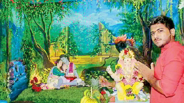 भिवंडीतील वळगाव येथील कलाकार हेमंत पाटील यांनी आपल्या घरी बाप्पाची प्रतिष्ठापना करताना डोळ्यांची पारणे फेडणारी परंपरागत इकोफ्रेंडली सजावट केली आहे. घरी येणाऱ्या पाहुण्यांचे आदरातिथ्य करण्यात आगरी-कोळी समाज नेहमीच एक पाऊल पुढे असतो. मग वर्षभराच्या प्रतीक्षेनंतर घरी येणाऱ्या लाडक्या गणरायाचे आदरातिथ्य करण्यात तो कसा मागे राहील. भिंतीवर, कपड्यांवर, नैसर्गिक रंगांनी रंगीबेरंगी पाना-फुलांची चित्रे रंगवून गणरायाची त्यात प्रतिष्ठापना करण्याची पद्धत आगरी-कोळी समाजात फार पूर्वीपासून आहे. हीच पारंपरिक कला हेमंत पाटील यांनी जोपासली आहे. डोळ्यांची पारणे फेडणाऱ्या परंपरागत इकोफ्रेंडली सजावट पाहावयाची असल्यास गणेशोत्सवास नक्की भेट द्या, असे आवाहन हेमंत यांनी केले आहे.