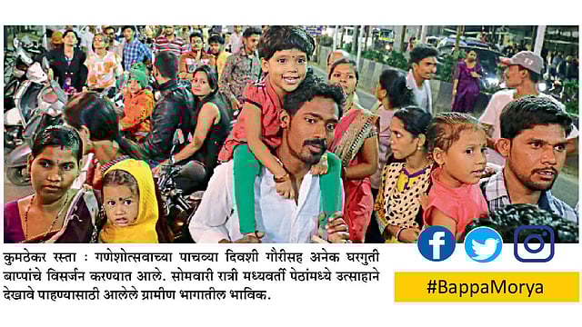 शिवाजी रस्त्यावरून आणि लक्ष्मी रस्त्यावरून भाविकांची ये-जा रात्री उशिरापर्यंत देखावे पाहण्यासाठी सुरू होती. मानाच्या पाच मंडळांसह श्रीमंत भाऊसाहेब रंगारी गणपती ट्रस्ट, श्रीमंत दगडूशेठ हलवाई सार्वजनिक गणपती ट्रस्ट, अखिल मंडई मंडळ, हुतात्मा बाबू गेनू मंडळ, लोकमान्य टिळक प्रथम प्रस्थापित गणपती ट्रस्ट (सरदार विंचूरकरवाडा), जिलब्या मारुती मंडळ, निंबाळकर तालीम, होनाजी तरुण मंडळ, छत्रपती राजाराम मंडळ, अखिल नवी पेठ हत्ती गणपती मंडळ, नेने घाट मित्र मंडळ यांसारख्या अनेक मंडळांचे देखावे पाहत त्या देखाव्यांचे मोबाईलमध्ये व्हिडिओ शूटिंगही नागरिक करत होते.