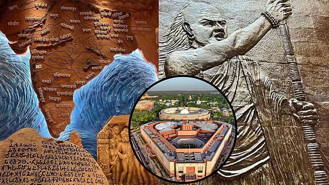 नव्या संसद भवनमध्ये लावण्यात आलेल्या भित्तीचित्रात (म्युरल) सम्राट अशोकाचे संपूर्ण साम्राज्य दाखवण्यात आलं आहे. शेजारील अनेक देशांचा यात समावेश असून अखंड भारताचा हा नकाशा आहे असा त्याचा अर्थ लावला जात आहे.