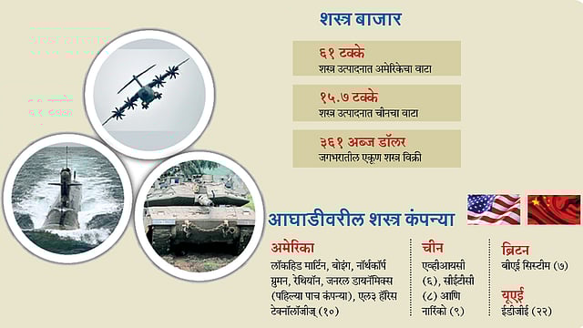 स्टॉकहोम इंटरनॅशनल पीस रिसर्च इन्स्टिट्यूट (सिप्री) या संस्थेने गेल्या वर्षातील शस्त्र व्यवहारांचा अभ्यास करत अहवाल प्रसिद्ध केला आहे. शस्त्र बाजारपेठेतील चीनचा वाटा वाढला असला आणि हा देश दुसऱ्या क्रमांकावर असला तरी अमेरिकेशी तुलना करता त्यांच्यातील अंतर बरेच आहे. शस्त्र उत्पादनात जगातील पहिल्या २५ देशांच्या एकूण उत्पादनापैकी एकट्या अमेरिकेचा वाटा ६१ टक्के आहे, तर चीनचा वाटा १५.७ टक्के आहे. या ‘टॉप २५’ देशांकडून झालेल्या विक्रीमध्ये ८.५ टक्क्यांनी वाढ झाली असून एकूण रक्कम ही संयुक्त राष्ट्रांच्या शांतता मोहिमांसाठी येणाऱ्या खर्चाच्या ५० पट अधिक आहे. शस्त्र विक्रीत आघाडीवर असलेल्या पहिल्या दहा कंपन्यांमध्ये अमेरिकेतील सहा, तर चीनमधील तीन कंपन्यांचा समावेश आहे. ब्रिटनमधील ‘बीएई सिस्टीम’ ही कंपनी यादीत सातव्या क्रमांकावर आहे.