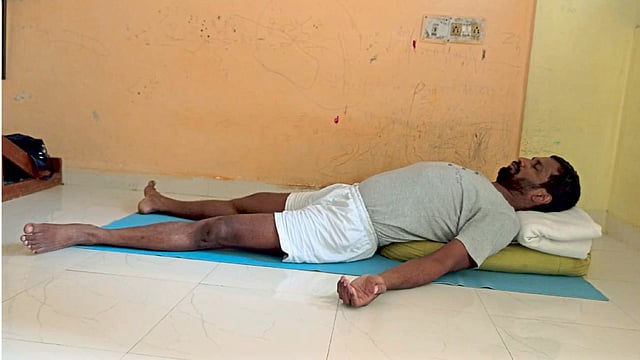 तळहात नितंबाशेजारी जमिनीवर ठेवा. कोपरे वाकवून पाठीचा कणा लांब करत हळूहळू लोडावर पाठ टेकवा. डोके किंचित उचलून ब्लॅंकेटची घडी खांद्यांना टेकवा आणि डोके त्यावर ठेवा.