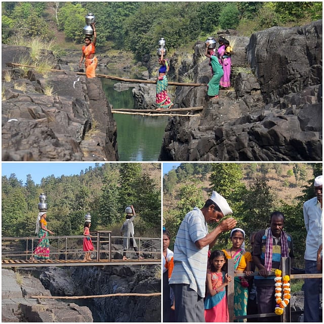 फोटो -आनंद बोराखरशेत वस्तीवरील तास नदीवर आदिवासी महिलांचा लाकडाच्या बल्लीवरून  पाण्यासाठी प्रवास अखेर संपला.
