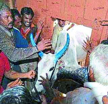 खिडकीतून कुदविले जातात बैल
