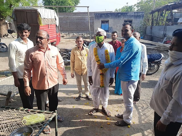 पारोळा ः मन करारे प्रसन्न सर्व सिध्दीचे कारण या युक्तीप्रमाणे करंजी ता,पारोळा येथील 80 वर्षीय निंबा ओंकार रोकडे यांचा एचआरसिटी स्कोअर 15 असतांना देखील स्वःआत्मविश्वासाने त्यांनी कोरोनावर मात करित ते सुखरुप घरी परतले. यावेळी सरपंच भैय्यासाहेब रोकडे व ग्रामस्थ व नातेवाईक यांनी त्यांचा सत्कार करित आनंद साजरा केला.