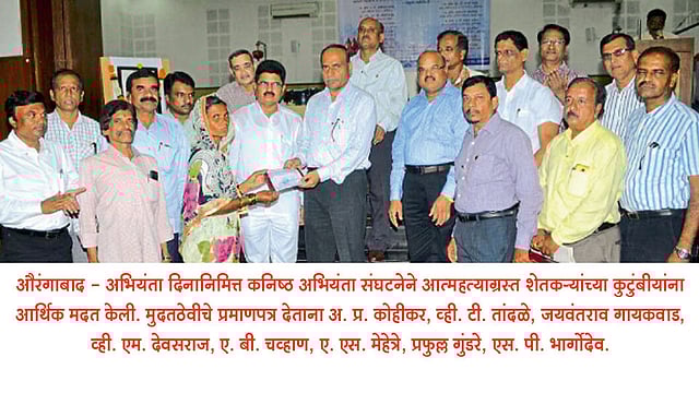 औरंगाबाद - अभियंता दिनाच्या निमित्ताने कनिष्ठ अभियंता संघटना व पतसंस्थेतर्फे आत्महत्याग्रस्त शेतकऱ्यांच्या पाच कुटुंबीयांना आर्थिक मदत करण्यात आली. त्याचप्रमाणे नेत्रदान संकल्प व रक्तदान शिबिर घेण्यात आले.