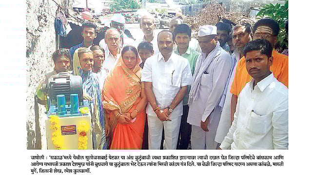 चापोली - येथील सुलोचनाबाई पेटकर यांच्या अंध कुटुंबाची व्यथा ‘सकाळ’मधे गुरुवारी (ता. १३ जुलै) प्रकाशित झाल्यानंतर याची दखल घेत जिल्हा परिषदेचे बांधकाम व आरोग्य सभापती प्रकाश देशमुख यांनी बुधवारी (ता. दोन) या कुटुंबांची भेट घेऊन त्यांना स्वावलंबी बनविण्यासाठी मिरची कांडप यंत्र दिले.