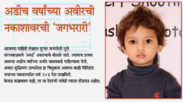 पिंपरी - आजच्या माहिती तंत्रज्ञान युगात जन्मलेली मुले संगणकाप्रमाणे "स्मार्ट' असल्याचे बोलले जाते. त्याचाच प्रत्यय अवघ्या अडीच वर्षांच्या अवीर जाधवकडे पाहिल्यावर येतो. अचाट बुद्धिमत्ता लाभलेला हा चिमुकला अवघ्या काही मिनिटांत जगाच्या नकाशावरील सर्व 203 देश दाखवितो. केवळ दाखवतच नाही, तर या देशांची नावेही त्याला तोंडपाठ आहेत. अवीर एवढ्याच वयाच्या न्यूयॉर्कमधील मुलाच्या नावावर पावणेपाच मिनिटांत नकाशावरील देश दाखविण्याचा विश्वविक्रम आहे. अवीर सध्या त्यासाठी पाच ते सहा मिनिटे घेत असला, तरी लवकरच हा विश्वविक्रम तोडून नवा प्रस्थापित करण्याच्या तो तयारीत आहे.