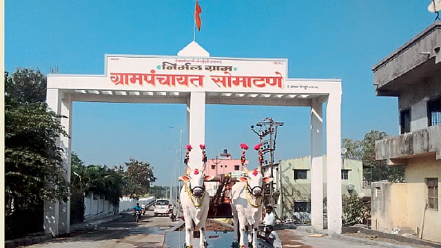 सोमाटणे - सोमाटणे ग्रामपंचायतीने पदरमोड व लोकसहभागातून गावात जाण्यासाठी चौपदरी रस्ता केला असून, शेतीच्या आठवणीसाठी प्रवेशद्वारावर बैलगाडीची बांधणी केली आहे. मावळातील हा पहिला गावासाठी चौपदरी रस्ता आहे.